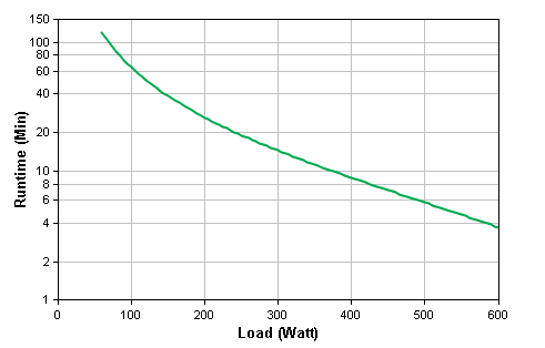 Hover over the line on the graph above to view the runtime at any desired load This graph is based on actual measured runtime data. All measurements were taken with new, fully charged batteries and a balanced resistive load (PF = 1.0). Actual runtimes may vary from the values of this graph. Actual runtimes are dependent on several variables including battery age, battery charge level, environmental conditions and characteristics of the connected load. |